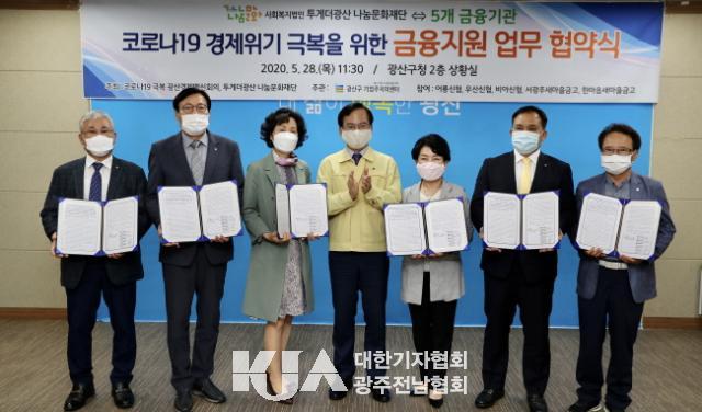 28ÀÏ ±¤»ê°æÁ¦¹é½ÅȸÀÇÀÇ ÁÖÀç·Î Åõ°Ô´õ±¤»ê ³ª´®¹®ÈÀç´Ü°ú 5°³ Áö¿ª ±ÝÀ¶±â°üÀÎ ¼±¤ÁÖ»õ¸¶À»±Ý°í¡¤ÇѸ¶À½»õ¸¶À»±Ý°í¡¤¾î·æ½ÅÇù¡¤¿ì»ê½ÅÇù¡¤ºñ¾Æ½ÅÇùÀÌ ±¤»ê±¸Ã»¿¡¼ ¡®Äڷγª19 ±Øº¹ ±ÝÀ¶Áö¿ø ¾÷¹«Çù¾à¡¯À» ü°áÇß´Ù.