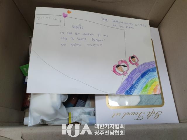 ƯÈ÷ ÇÑ ¾î¸°ÀÌ´Â »ýÇÊǰ ¼¼Æ® 1¹Ú½º¸¦ º°µµ·Î º¸³»±âµµ Çß´Ù. »óÀÚ¿¡´Â Ä¡¾à, Ä©¼Ö, ºñ´©, ¼ö°Ç µî°ú ÇÔ²² »ß¶Ô»ß¶ÔÇÏÁö¸¸ Á¤¼ºÀ» ´ãÀº ¼ÕÆíÁö°¡ µé¾îÀÖ¾ú´Ù. ±×¸®°í ÆíÁö ÇÏ´Ü¿¡´Â ±¸È£¹°Ç°À» º¸³½ ÀÌÀÇ µû¶æÇÑ ¸¶À½Ã³·³ ¾Ë·Ï´Þ·ÏÇÑ ¹«Áö°³ À§¿¡¼ µÎ ¸íÀÇ »ç¶÷ÀÌ ÇÏÆ®¸¦ º¸³»°í ÀÖ´Â ¸ð½ÀÀÌ ±×·ÁÁ® ÀÖ¾ú´Ù.