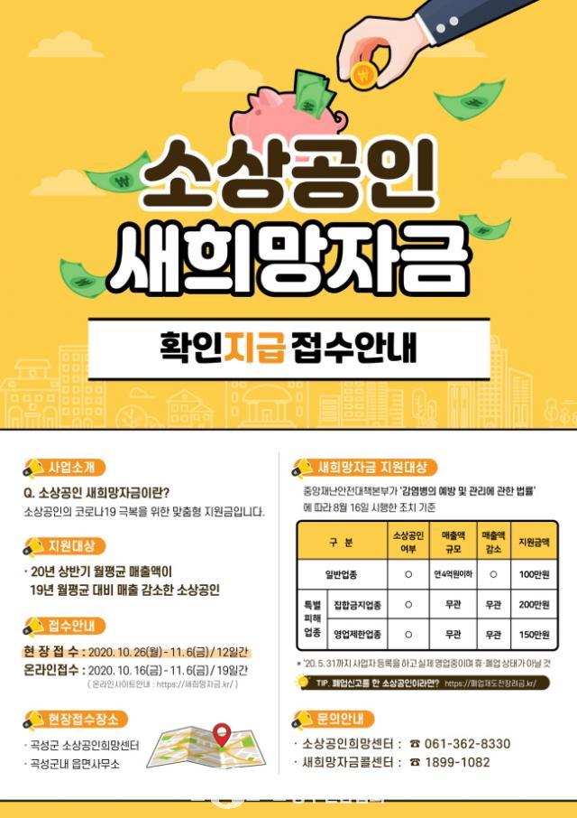 ¼Ò»ó°øÀÎ »õÈñ¸ÁÀÚ±ÝÀº Äڷγª19·Î ¸ÅÃâÀÌ °¨¼ÒÇϰųª ÁýÇÕ±ÝÁö ¶Ç´Â ¿µ¾÷Á¦ÇÑ µîÀÇ ¸í·ÉÀ» ¹ÞÀº ¼Ò»ó°øÀο¡°Ô Á¤ºÎ¿¡¼ Áö¿øÇÏ´Â 2Â÷ Àç³Áö¿ø±ÝÀ¸·Î Á¤ºÎ°¡ ÇàÁ¤Á¤º¸¸¦ º¸À¯ÇÑ ¼Ò»ó°øÀο¡ ´ëÇØ¼´Â Ãß¼®Àü ¹®Àڹ߼ÛÀ» ÅëÇØ »õÈñ¸ÁÀÚ±Ý ½Å¼ÓÁö±ÞÀ» ¾È³»Çϰí 9. 24.(¸ñ)ºÎÅÍ ¿Â¶óÀÎ Á¢¼ö¸¦ ½ÃÀÛÇÑ ¹Ù ÀÖ´Ù.