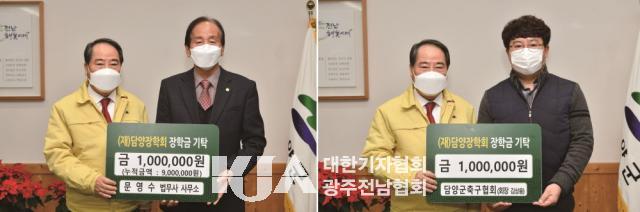 (Àç)´ã¾çÀåÇÐȸ¿¡ µû¸£¸é, Áö³ 30ÀÏ ¹®¿µ¼ö ¹ý¹«»ç¿Í ´ã¾ç±ºÃ౸Çùȸ(ȸÀå ±è»ó¿ë)°¡ °¢°¢ 100¸¸ ¿øÀÇ ÀåÇбÝÀ» ±âŹÇß´Ù°í ÀüÇß´Ù.