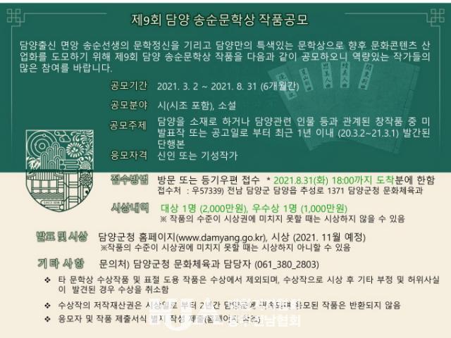 [´ëÇѱâÀÚÇùȸ ´ã¾ç±ºÁöȸ ¼ÛÁøÇö ±âÀÚ] ´ã¾ç±ºÀÌ ¸é¾ç ¼Û¼ø¼±»ýÀÇ ¹®ÇÐÁ¤½ÅÀ» ±â¸®°í ´ã¾ç¸¸ÀÇ Æ¯»ö ÀÖ´Â ¹®ÇлóÁ¤¸³À¸·Î Àü±¹ ½ÅÀÎ ¹®ÀÎÀÛ°¡ µî¿ë¹®À¸·Î ÀÚ¸®¸Å±èÇϰíÀÚ Á¦9ȸ ¼Û¼ø¹®Çлó ÀÛǰ °ø¸ð¸¦ ÁøÇàÇÑ´Ù.