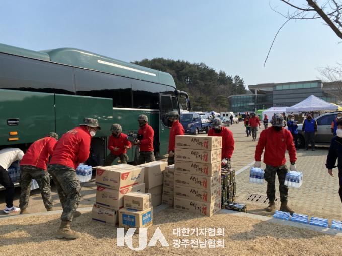 [´ëÇѱâÀÚÇùȸ ´ã¾ç±ºÁöȸ ¼ÛÁøÇö ±âÀÚ] ´ã¾ç±ºÀÌ °©ÀÛ½º·¯¿î »êºÒ·Î ¾î·Á¿òÀ» °Þ°í ÀÖ´Â ´ë±¸±¤¿ª½Ã ´Þ¼º±º, °æ»óºÏµµ ¿ïÁø±º¿¡ ÇÖÆÑ, »ý¼ö, »§ µî 1õ¸¸ ¿ø »ó´çÀÇ ¹°Ç°À» Áö¿øÇß´Ù.