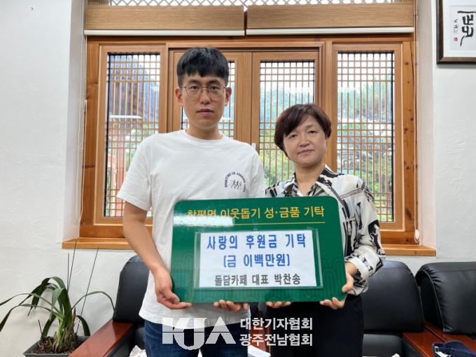 [´ëÇѱâÀÚÇùȸ ´ã¾ç±ºÁöȸ ¼ÛÁøÇö ±âÀÚ] ´ã¾ç±º âÆò¸é µ¹´ãÄ«Æä ¹ÚÂù¼Û ´ëÇ¥°¡ Áö³ 12ÀÏ Ã¢Æò¸é»ç¹«¼Ò¿¡ Æø¿°¿¡ »ó´ëÀûÀ¸·Î Ãë¾àÇÑ ÀÌ¿ôµéÀ» À§ÇÑ ÈÄ¿ø±Ý 200¸¸ ¿øÀ» ±âŹÇß´Ù°í ¹àÇû´Ù.