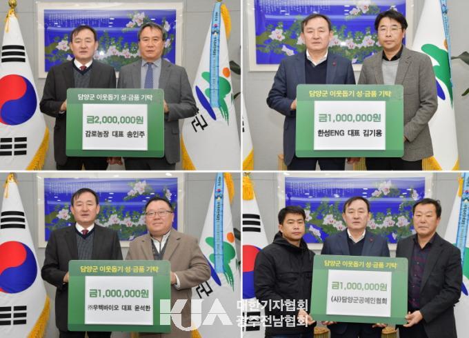 ´ã¾ç±º¿¡ µû¸£¸é °¨·Î³óÀå ¼ÛÀÎÁÖ ´ëÇ¥°¡ Çö±Ý 200¸¸¿øÀ», ÇѼºENG(´ëÇ¥ ±è±â¿ë)¿Í (ÁÖ)¿ìÅØ¹ÙÀÌ¿À(´ëÇ¥ À±¼®ÇÑ), (»ç)´ã¾ç±º°ø¿¹ÀÎÇùȸ(´ëÇ¥ Ç㹫)¿¡¼ Çö±Ý 100¸¸ ¿øÀ» ±âŹÇϸç ÀÌ¿ô¿¡°Ô »ç¶ûÀ» ÀüÇÏ´Â ³ª´® Ȱµ¿À» ½ÇõÇß´Ù.