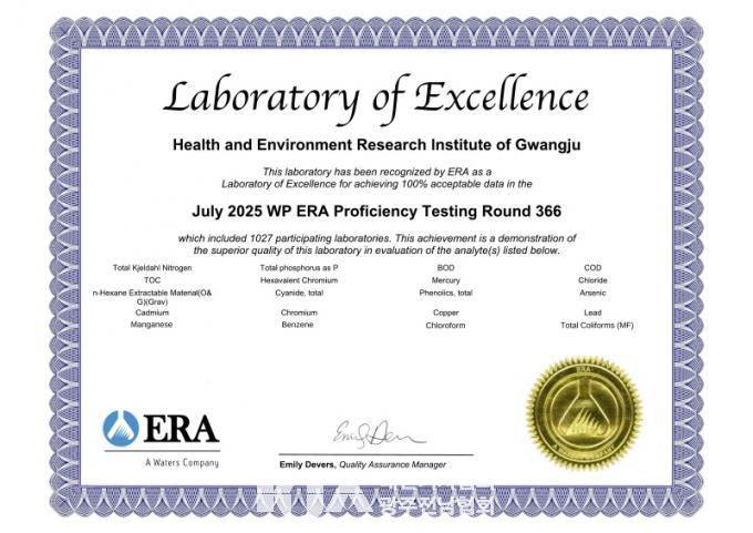 [´ëÇѱâÀÚÇùȸ ±¤ÁÖÀü³²Çùȸ] ±¤ÁÖ±¤¿ª½Ã º¸°Çȯ°æ¿¬±¸¿øÀÌ ÃÖ±Ù ¹Ì±¹ ȯ°æÀÚ¿øÇùȸ(ERA)°¡ ÁÖ°üÇÑ ¼öÁúºÐ¾ß ±¹Á¦ ¼÷·Ãµµ½ÃÇè¿¡¼ Àü Ç׸ñ ¡®¸¸Á·(Satisfactory)¡¯ ÆÇÁ¤À» ¹Þ¾Æ ¡®2025 ÃÖ¿ì¼ö ºÐ¼®±â°ü(Laboratory of Excellence)¡¯À¸·Î ¼±Á¤µÆ´Ù.