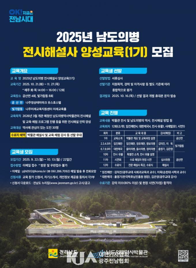[´ëÇѱâÀÚÇùȸ ±¤ÁÖÀü³²Çùȸ] Àü¶ó³²µµ´Â 2026³â 3¿ù °³°ü ¿¹Á¤ÀÎ ³²µµÀǺ´¿ª»ç¹Ú¹°°ü¿¡¼ Ȱµ¿ÇÒ Àü½ÃÇØ¼³»ç¿Í ±³À°¡¤Ã¼Çè °»ç ¾ç¼ºÀ» À§ÇØ ¿À´Â 10¿ù 13ÀϱîÁö ±³À°»ý 30¸íÀ» ¸ðÁýÇÑ´Ù°í ¹àÇû´Ù.
