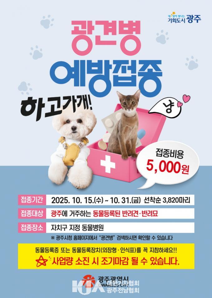 | ±¤ÁÖ±¤¿ª½Ã, ¹Ý·Á°ß.¹Ý·Á¹¦ ±¤°ßº´ ¿¹¹æÁ¢Á¾ »ç¾÷ ½Ç½Ã 15⁓31ÀÏ ÁöÁ¤ µ¿¹°º´¿ø¼¡¦¿¹¹æÁ¢Á¾ºñ 5000¿øÀÌ¸é °¡´É |