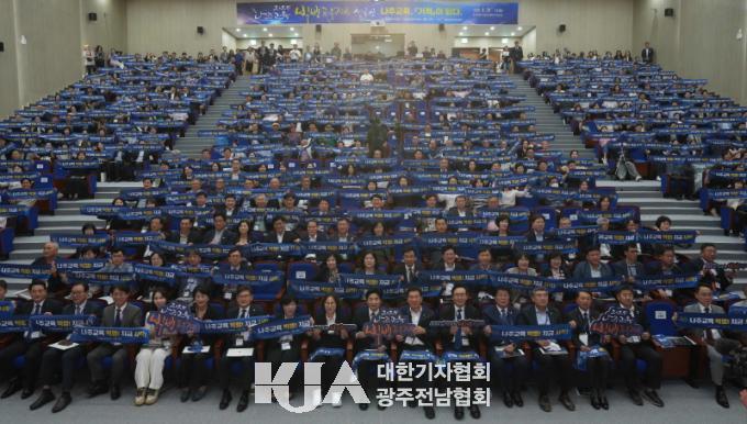 À̳¯ ¼±Æ÷½Ä¿¡´Â À±º´Å ³ªÁÖ½ÃÀå, ½ÅÁ¤ÈÆ ±¹È¸ÀÇ¿ø, ±è´ëÁß Àü³²µµ±³À°°¨, ÀÌÀç³² ³ªÁÖ½ÃÀÇȸ ÀÇÀåÀ» ºñ·ÔÇØ Çõ½Åµµ½Ã ÀÌÀü°ø°ø±â°ü ´ëÇ¥, ±³À° °ü°èÀÚ, Çкθð, ½Ã¹Î µî 1000¿© ¸íÀÌ Âü¼®ÇØ ³ªÁÖ±³À°ÀÇ »õ·Î¿î Ãâ¹ßÀ» ÇÔ²¾ Çß´Ù.