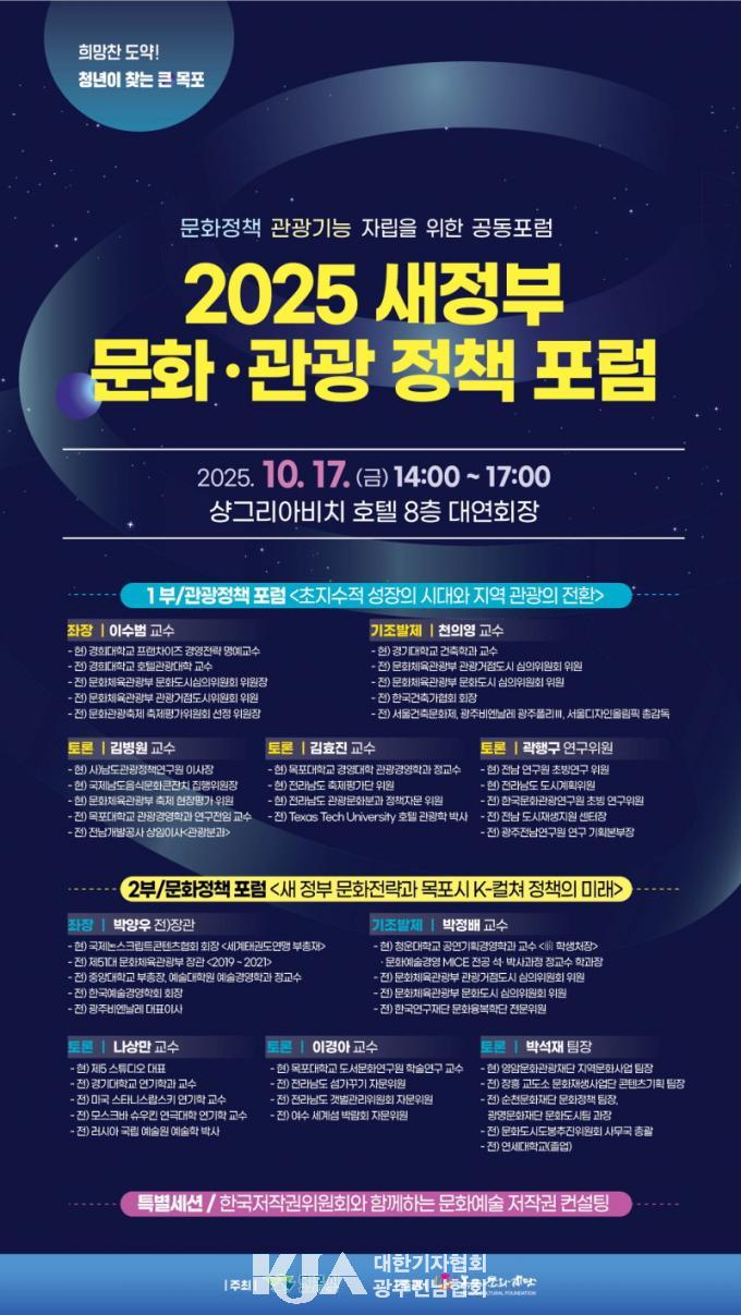 1ºÎ °ü±¤Æ÷·³Àº ¡®ÃÊÁö¼öÀû ¼ºÀåÀÇ ½Ã´ë¿Í Áö¿ª °ü±¤ÀÇ Àüȯ¡¯, 2ºÎ ¹®ÈÆ÷·³Àº ¡®»õÁ¤ºÎÀÇ ¹®ÈÀü·«°ú ¸ñÆ÷½Ã K-ÄÃó Á¤Ã¥ÀÇ ¹Ì·¡¡¯¸¦ ÁÖÁ¦·Î ÁøÇàµÈ´Ù. ¹Ú¾ç¿ì Àü ¹®ÈüÀ°°ü±¤ºÎ Àå°üÀ» ºñ·ÔÇØ ¹®È¡¤°ü±¤ ºÐ¾ßÀÇ Àü¹® ±³¼öµéÀÌ ÁÂÀå°ú ±âÁ¶¹ßÁ¦¸¦ ¸ÃÀ¸¸ç, °¢ ¼¼¼Ç ÁÖÁ¦¹ßÇ¥ ÈÄ¿¡´Â Áö¿ª ±³¼ö ¹× Àü¹®°¡µéÀÌ Âü¿©ÇÏ´Â ½ÉÃþ Åä·ÐÀÌ À̾îÁú ¿¹Á¤ÀÌ´Ù.