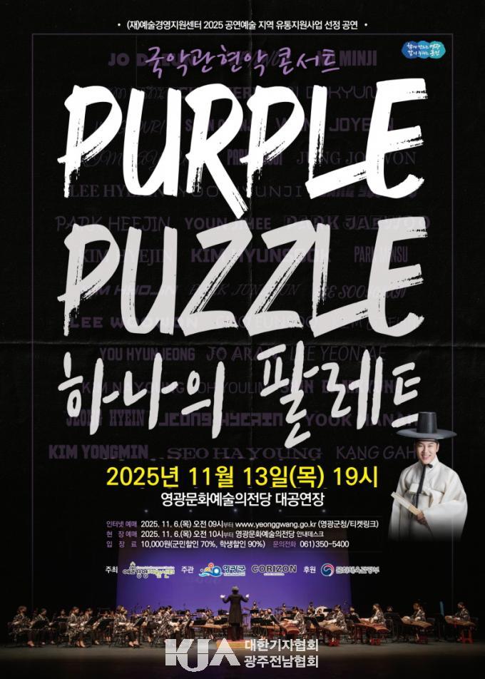 [´ëÇѱâÀÚÇùȸ ¿µ±¤±ºÁöȸ] ¿µ±¤±º(±º¼ö Àå¼¼ÀÏ)Àº ¿À´Â 11¿ù 13ÀÏ(¸ñ) ¿ÀÈÄ 7½Ã¿¡ ¿µ±¤¹®È­¿¹¼úÀÇÀü´ç ´ë°ø¿¬Àå¿¡¼­ ±¹¾Ç°üÇö¾Ç´Ü ÄÚ¶óÀÌÁðÀÇ ¡®PURPLE PUZZLE:ÇϳªÀÇ ÆÈ·¹Æ®¡¯¸¦ °ø¿¬ÇÑ´Ù.