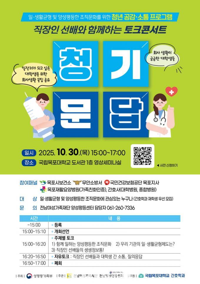 [´ëÇѱâÀÚÇùȸ ±¤ÁÖÀü³²Çùȸ] Àü³²¿©¼º°¡Á·Àç´ÜÀº Áö³ 10¿ù 30ÀÏ(¸ñ), ±¹¸³¸ñÆ÷´ëÇб³¿¡¼ Àü³² Áö¿ª û³âµé°ú º¸°Ç °è¿ ¼±¹è Á¾»çÀÚµéÀÌ ÇÔ²² ¸ð¿© ÀÏ¡¤»ýȰ±ÕÇü ¹× ÆòµîÇÑ Á¶Á÷¹®È¸¦ ÁÖÁ¦·Î ÀÚÀ¯·Ó°Ô ¼ÒÅëÇÏ´Â ¡®Ã»±â¹®´ä¡¯ ÇÁ·Î±×·¥À» °³ÃÖÇß´Ù.