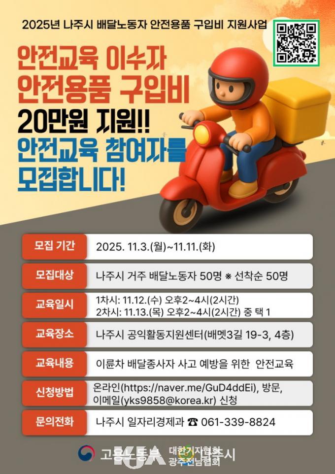 | ³ªÁÖ½Ã, 2025³â ¹è´Þ³ëµ¿ÀÚ ¾ÈÀü¿ëǰ ±¸ÀÔºñ Áö¿ø»ç¾÷ ÃßÁø ¾ÈÀüÇÑ ³ëµ¿È¯°æ Á¶¼º ÀÌ·ûÂ÷ ±³Åë¾ÈÀü±³À° À̼öÀÚ ´ë»ó¡¦1Àδç ÃÖ´ë 20¸¸ ¿ø Áö¿ø |
