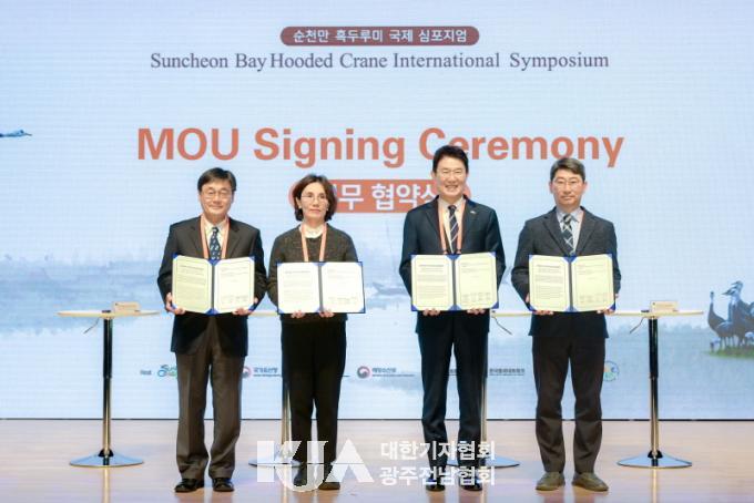 Áö³­ 5ÀÏ ¼øÃµ½Ã¡¤±¹Á¦µÎ·ç¹ÌÀç´Ü¡¤Çѱ¹Á¶·ùÇÐȸ¡¤Çѱ¹¹°»õ³×Æ®¿öÅ© °£ ÈæµÎ·ç¹Ì ¼­½ÄÁö º¸ÀüÀ» À§ÇÑ 4ÀÚ ¾÷¹«Çù¾àÀ» ü°áÇÏ°í ±â³ä»çÁøÀ» ÃÔ¿µÇϰí ÀÖ´Ù (ÁÂÃøºÎÅÍ Çѱ¹¹°»õ³×Æ®¿öÅ© ´ëÇ¥ À̱⼷, ±¹Á¦µÎ·ç¹ÌÀç´Ü ¾Æ½Ã¾Æ´ã´çÀÚ À§Ä¡¿£, ¼øÃµ½Ã ½ÃÀå ³ë°ü±Ô, (»ç)Çѱ¹Á¶·ùÇÐȸ ȸÀå ¹ÚÁø¿µ)