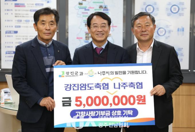 [´ëÇѱâÀÚÇùȸ °­Áø±ºÁöȸ ±è¿µÀÏ ±âÀÚ] °­Áø¿ÏµµÃàÇù, ³ªÁÖÃàÇù ÀÓÁ÷¿øµéÀÌ Áö³­ 18ÀÏ °­Áø±ºÃ»À» ã¾Æ °íÇâ»ç¶û±âºÎ±Ý 500¸¸¿øÀ» »óÈ£ Áö¿ª¿¡ ±âºÎÇß´Ù. ¶ÇÇÑ À̳¯ °í¼­°æ (À¯)µðÀÚÀνºÅ丮 ´ëÇ¥°¡ 200¸¸¿øÀ», ±èÁø¼º Ã»ÇØÇªµå¶û ´ëÇ¥ 100¸¸¿ø, ÁøÀ̶û °¡¼öÀÇ °íÇâ»ç¶û±âºÎ±Ý 100¸¸¿ø ±âŹÀÌ À̾îÁ® ½Ò½ÒÇÑ ³¯¾¾¿¡ µû¶æÇÑ °¨µ¿À» ÀھƳ´Ù.