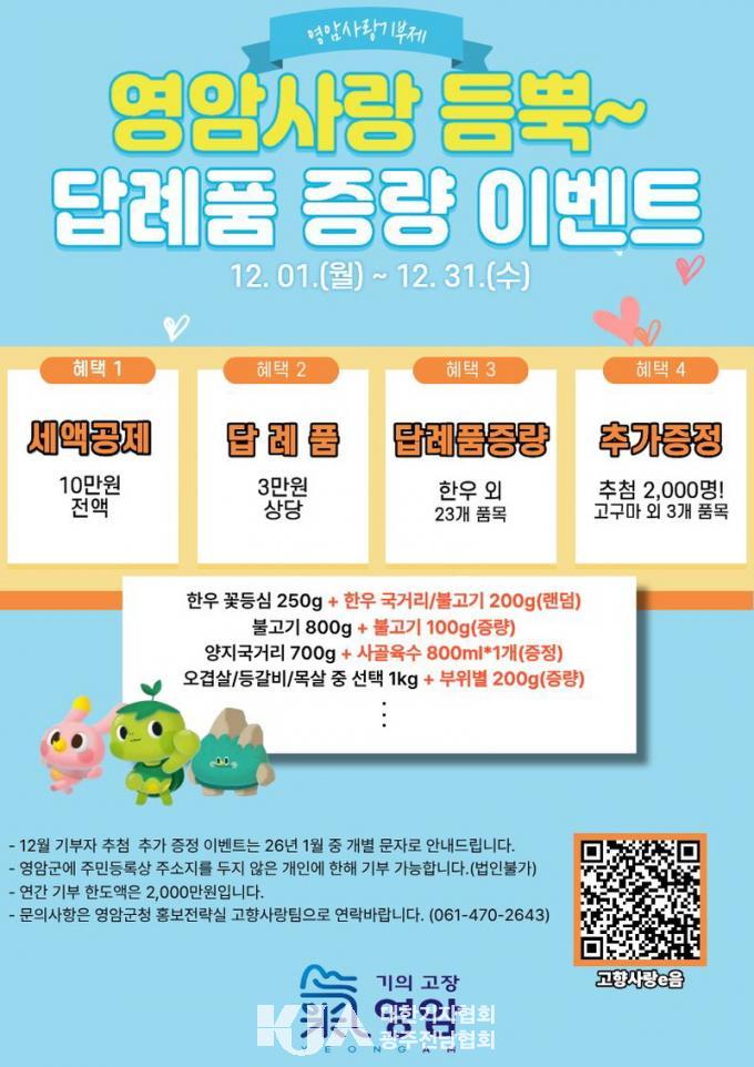 ÀÌ¿µÁÖ ¿µ¾Ï±º È«º¸Àü·«½ÇÀåÀº ¡°¿µ¾Ï±º °íÇâ»ç¶û±âºÎ¿¡ º¸³» ÁØ ¼º¿ø¿¡ º¸´äÇϱâ À§ÇØ 11¿ù¿¡ À̾î 12¿ù¿¡µµ ´õ¿í dz¼ºÇÑ ÇýÅÃÀ» ¸¶·ÃÇß´Ù. ¿µ¾Ï±º ³ó¡¤Æ¯»ê¹°ÀÇ ¿ì¼ö¼ºÀ» ³Î¸® ¾Ë¸®°í ±âºÎÀÚ ¸¸Á·µµ¸¦ ³ôÀÏ ¼ö ÀÖµµ·Ï ´Ù¾çÇÑ ÇÁ·Î±×·¥À» Áö¼Ó ÃßÁøÇϰڴ١±°í ¸»Çß´Ù.