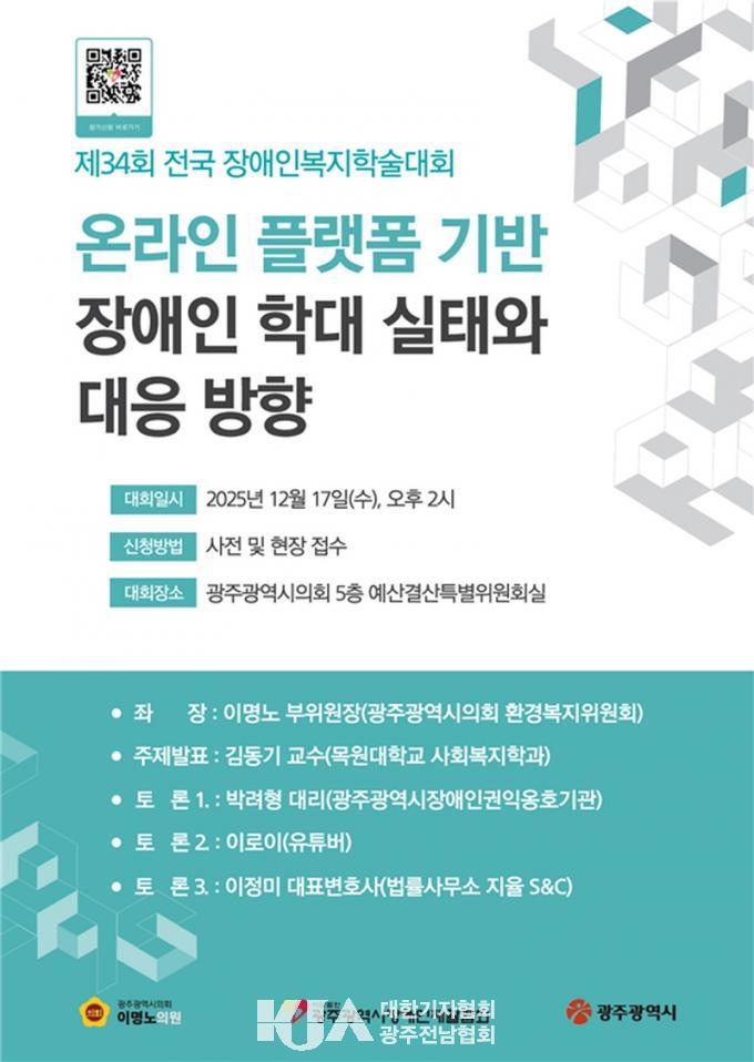[´ëÇѱâÀÚÇùȸ ±¤ÁÖÀü³²Çùȸ] (»ç)±¤ÁÖ±¤¿ª½ÃÀå¾ÖÀÎÀçȰÇùȸ(ȸÀå ³ªÁ¾¸¸)´Â ¿À´Â 12¿ù 17ÀÏ ±¤ÁÖ±¤¿ª½ÃÀÇȸ 5Ãþ ¿¹»ê°á»êƯº°À§¿øÈ¸½Ç¿¡¼­ ¡®Á¦34ȸ Àü±¹ Àå¾ÖÀκ¹ÁöÇмú´ëȸ¡¯¸¦ °³ÃÖÇÑ´Ù°í ¹àÇû´Ù.