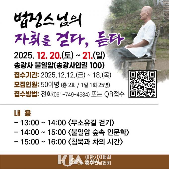 [´ëÇѱâÀÚÇùȸ ¼øÃµ½ÃÁöȸ] ¼øÃµ½Ã´Â ¹ýÁ¤½º´ÔÀÇ »î°ú Á¤½ÅÀ» ½Ã¹Îµé°ú ÇÔ²² ³ª´©±â À§ÇÑ Àι® üÇè ÇÁ·Î±×·¥ ¡¸¹ýÁ¤½º´ÔÀÇ ÀÚÃ븦 °È´Ù, µè´Ù¡¹¸¦ ¿À´Â 20ÀϺÎÅÍ 21ÀϱîÁö ¼Û±¤»ç ºÒÀÏ¾Ï ÀÏ¿ø¿¡¼­ ¿î¿µÇÑ´Ù°í ¹àÇû´Ù.