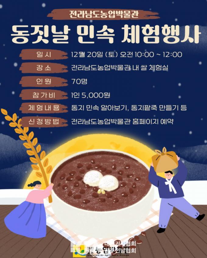 Çà»ç´Â µ¿Áþ³¯ÀÇ Àý±âÀû ÀÇ¹Ì¿Í ÀüÅë ¹Î¼ÓÀ» ¼Ò°³Çϰí, µ¿ÁöÆÏÁ×À» ¸¸µé¾î º¸´Â üÇè Á᫐ ÇÁ·Î±×·¥À¸·Î ±¸¼ºµÆ´Ù. ¼±Âø¼ø 70¸íÀ̸ç, Âü°¡ ½ÅûÀº Àü³²µµ³ó¾÷¹Ú¹°°ü ´©¸®Áý(