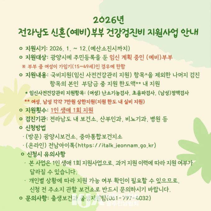 [´ëÇѱâÀÚÇùȸ ±¤¾ç½ÃÁöȸ] ±¤¾ç½Ã´Â Àü¶ó³²µµ°¡ ÃßÁøÇÏ´Â ¡®½ÅÈ¥(¿¹ºñ)ºÎºÎ °Ç°°ËÁøºñ Áö¿ø»ç¾÷¡¯¿¡ ¸ÂÃç, 2026³â¿¡µµ ÀÓ½ÅÀ» ÁغñÇÏ´Â ºÎºÎ¸¦ ´ë»óÀ¸·Î °Ç°°ËÁøºñ Áö¿ø»ç¾÷À» Áö¼Ó ¿î¿µÇÑ´Ù°í ¹àÇû´Ù.