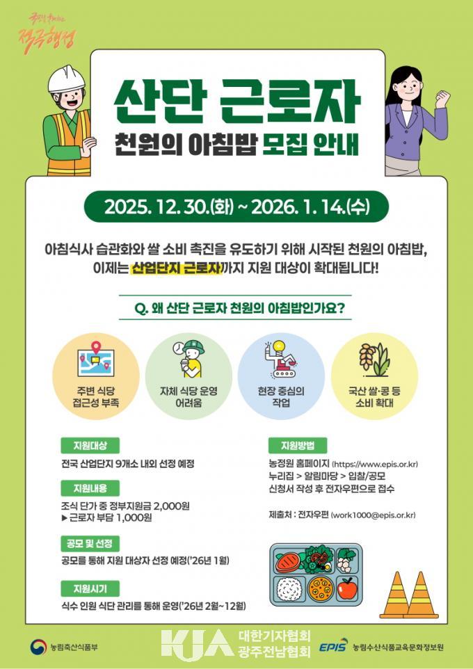 | Àü¶ó³²µµ, Áß¼Ò±â¾÷ ±Ù·ÎÀÚ Ãµ¿øÀÇ ¾ÆÄ§¹ä ¹× µçµçÇÑ Á¡½É¹ä Áö¿ø»ç¾÷ ÃßÁø ¡®Ãµ¿øÀÇ ¾ÆÄ§¹ä¡¯ 14ÀÏ¡¤¡®µçµçÇÑ Á¡½É¹ä¡¯ 21ÀϱîÁö Á¢¼ö |