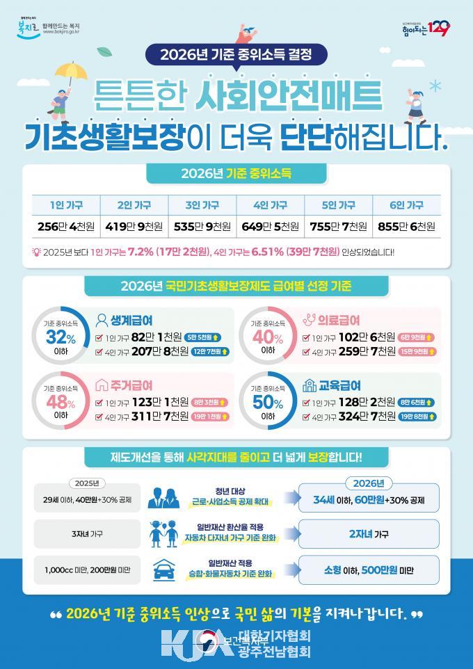 2026³â ±âÁØÁßÀ§¼Òµæ(±¹¹Î °¡±¸¼ÒµæÀÇ Áß°£°ªÀ¸·Î º¹Áö»ç¾÷À» ¼±Á¤ÇÏ´Â ±âÁØ)Àº 4ÀÎ °¡±¸ ±âÁØ 649¸¸ 4õ738¿øÀ¸·Î Áö³Çغ¸´Ù 6.51% ÀÎ»óµÆ´Ù. ¹°°¡ »ó½Â°ú »ý°èºñ ºÎ´ã Áõ°¡¸¦ ¹Ý¿µÇÑ ¿ª´ë ÃÖ°í ¼öÁØÀÇ Àλó·üÀÌ´Ù.