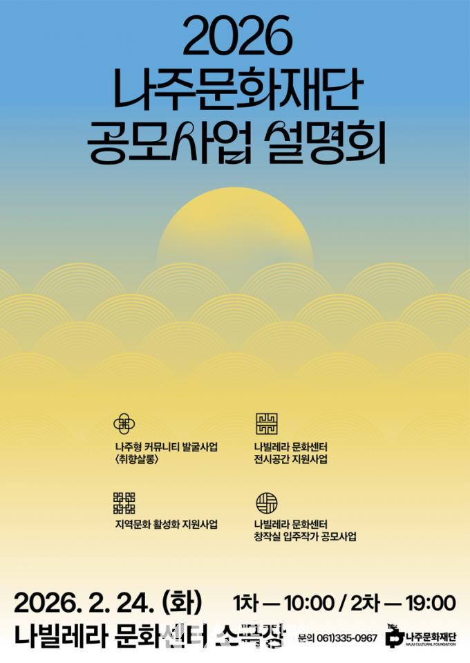 ³ªÁÖ¹®ÈÀç´ÜÀº ¿À´Â 2¿ù 24ÀÏ ³ªºô·¹¶ó¹®È¼¾ÅÍ ¼Ò±ØÀå¿¡¼ ¡®2026³â ³ªÁÖ¹®ÈÀç´Ü ÅëÇÕ °ø¸ð»ç¾÷¼³¸íȸ¡¯¸¦ ¿¬´Ù°í 13ÀÏ ¹àÇû´Ù. À̹ø ¼³¸íȸ´Â Áö¿ª¹Î°ú ¿¹¼úÀÎÀ» ´ë»óÀ¸·Î Àç´ÜÀÇ ¿¬Áß »ç¾÷À» Á¾ÇÕÀûÀ¸·Î ¾È³»ÇÏ°í °ø¸ð»ç¾÷ Âü¿©¸¦ µ¶·ÁÇϱâ À§ÇØ ¸¶·ÃÇß´Ù.