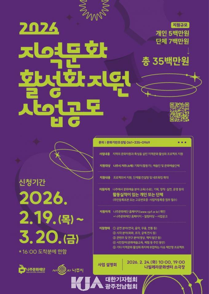 ³ªÁÖ¹®ÈÀç´ÜÀº ¡®2026 Áö¿ª¹®È Ȱ¼ºÈ Áö¿ø»ç¾÷¡¯ °ø¸ð¸¦ ¿À´Â 3¿ù 20ÀÏ ¿ÀÈÄ 4½Ã±îÁö ÁøÇàÇÑ´Ù°í 19ÀÏ ¹àÇû´Ù.