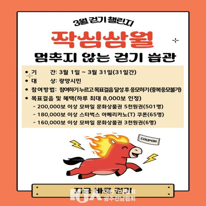 | ±¤¾ç½Ã, ¿öÅ©¿Â ¡®À۽ɻï¿ù, ¸ØÃßÁö ¾Ê´Â °È±â ½À°ü! 3¿ù °È±â 縰Áö¡¯ ¿î¿µ 3¿ù 1ÀϺÎÅÍ 31ÀϱîÁö... ¸ñÇ¥ °ÉÀ½ ´Þ¼ºÀÚ 572¸í¿¡ ¸ð¹ÙÀÏ »óǰ±Ç µî Áö±Þ |