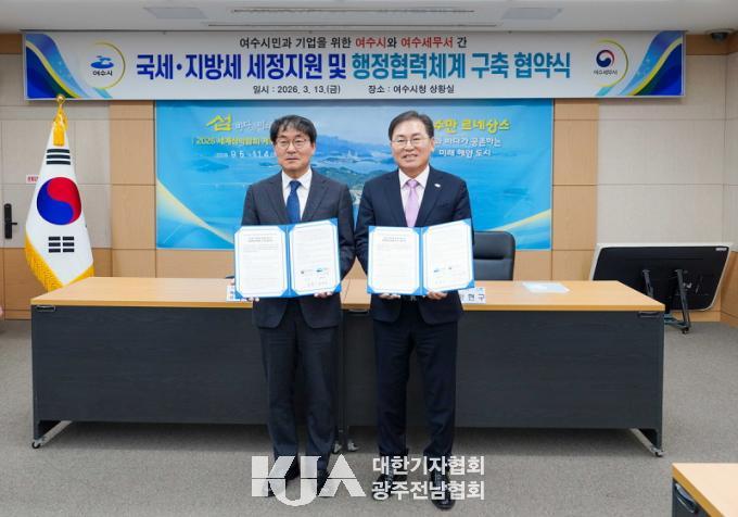[´ëÇѱâÀÚÇùȸ ¿©¼ö½ÃÁöȸ] ¿©¼ö½Ã°¡ ¿©¼ö¼¼¹«¼­(¼­Àå ±èÈÆ)¿Í 13ÀÏ ¿©¼ö½Ãû »óȲ½Ç¿¡¼­ ¡®±¹¼¼¡¤Áö¹æ¼¼ ¼¼Á¤ Áö¿ø ¹× ÇàÁ¤ Çù·Âü°è ±¸ÃàÀ» À§ÇÑ ¾÷¹«Çù¾à(MOU)¡¯À» ü°áÇß´Ù°í ¹àÇû´Ù.