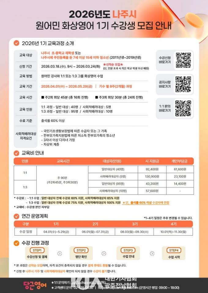 | ³ªÁÖ½Ã, 2026³â ¿ø¾î¹Î Ȼ󿵾î 1±â ¼ö°»ý ¸ðÁý ÃÊ¡¤ÁßÇлý 150¸í ´ë»ó 3¿ù 18ÀϺÎÅÍ 24ÀϱîÁö Á¢¼ö |