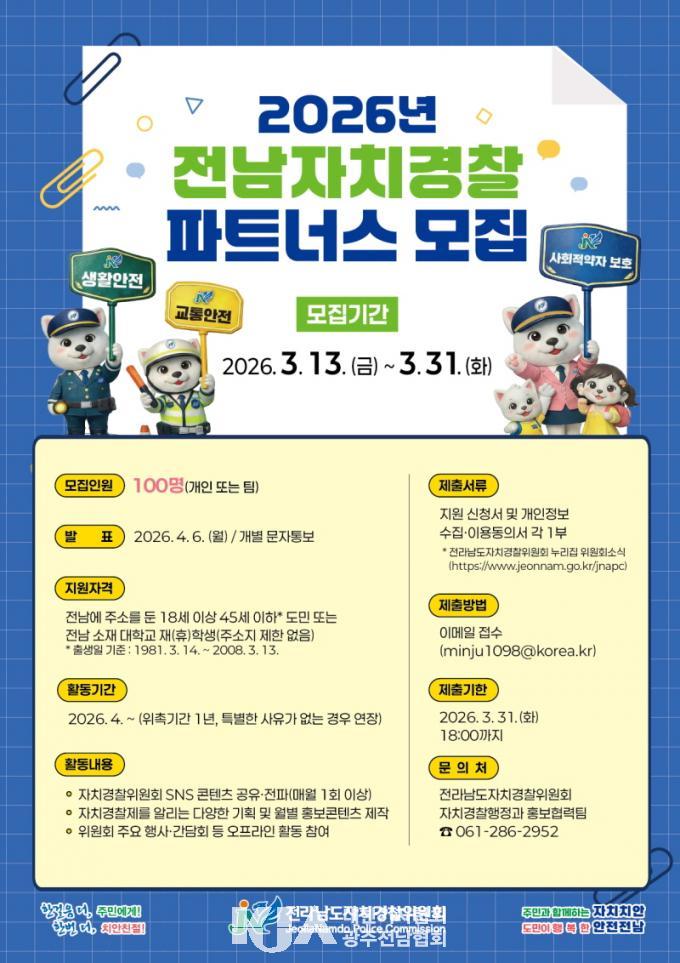 | Àü¶ó³²µµ, 2026³â Àü³²ÀÚÄ¡°æÂû ÆÄÆ®³Ê½º ¸ðÁý SNS ÄÜÅÙÃ÷ Á¦ÀÛ¡¤È«º¸·Î ÀÚÄ¡°æÂû°ú µµ¹Î ¼ÒÅë °¡±³¿ªÇÒ |