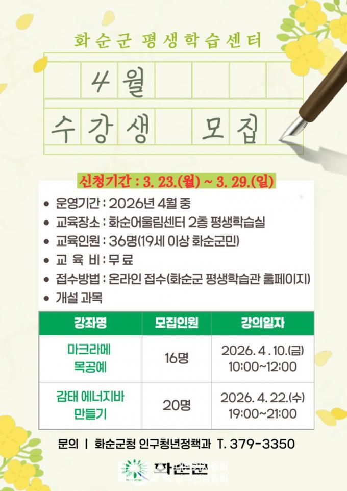 | ȼø±º, 4¿ù Æò»ýÇнÀ¼¾ÅÍ ÇÁ·Î±×·¥ Âü¿©ÀÚ ¸ðÁý 2°³ °úÁ¤ ¿î¿µ... 3¿ù 23ÀϺÎÅÍ 29ÀϱîÁö ¼±Âø¼ø Á¢¼ö |