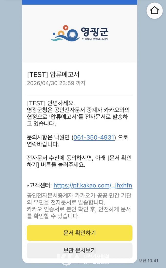 [´ëÇѱâÀÚÇùȸ ¿µ±¤±ºÁöȸ] ¿µ±¤±ºÀº 4¿ù 9ÀÏ Áö¹æ¼¼ 30¸¸ ¿ø ÀÌ»ó °í¾×ü³³ÀÚ 767¸íÀ» ´ë»óÀ¸·Î ÃÑ 21¾ï 1,300¸¸ ¿øÀÇ Ã¼³³¾×¿¡ ´ëÇØ 「īī¿À ¾Ë¸²Åå」À¸·Î ¾Ð·ù¿¹°í¼¸¦ ¹ß¼ÛÇß´Ù°í ¹àÇû´Ù.