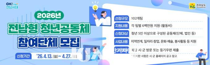 | Àü¶ó³²µµ, 2026 Àü³²Çü û³â°øµ¿Ã¼ Ȱ¼ºÈ »ç¾÷ ÃßÁø ¡®Àü³²Çü û³â°øµ¿Ã¼ Ȱ¼ºÈ »ç¾÷¡¯ Âü¿©Çϼ¼¿ä! 27ÀϱîÁö Á¢¼ö Áö¿ª Á¤ÂøÀ§ÇØ ÆÀ´ç 600¸¸¿ø Áö¿ø |