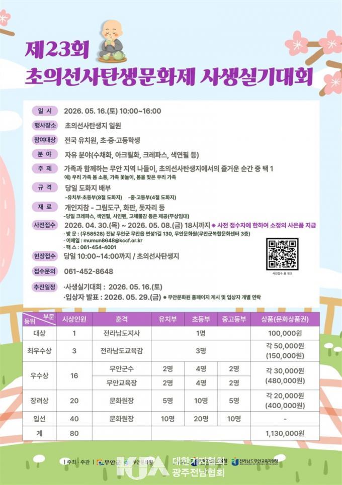 [´ëÇѱâÀÚÇùȸ ¹«¾È±ºÁöȸ ¹ÚÁ¤Èñ ±âÀÚ] ¹«¾È¹®È¿ø¿¡¼ ¡®Á¦23ȸ ÃÊÀǼ±»çź»ý¹®ÈÁ¦¡¯¸¦ ±â³äÇÏ´Â »ç»ý½Ç±â´ëȸ¸¦ °³ÃÖÇÒ ¿¹Á¤ÀÌ´Ù. ´ëȸ ÀϽô 5¿ù 16ÀÏ(Åä) 10½ÃºÎÅÍ 16½Ã±îÁö·Î, ÃÊÀǼ±»çź»ýÁö ÀÏ¿ø¿¡¼ Àü±¹ À¯Ä¡¿ø, ÃÊ¡¤Áß¡¤°íµîÇлýµéÀ» ´ë»óÀ¸·Î °³ÃֵȴÙ.