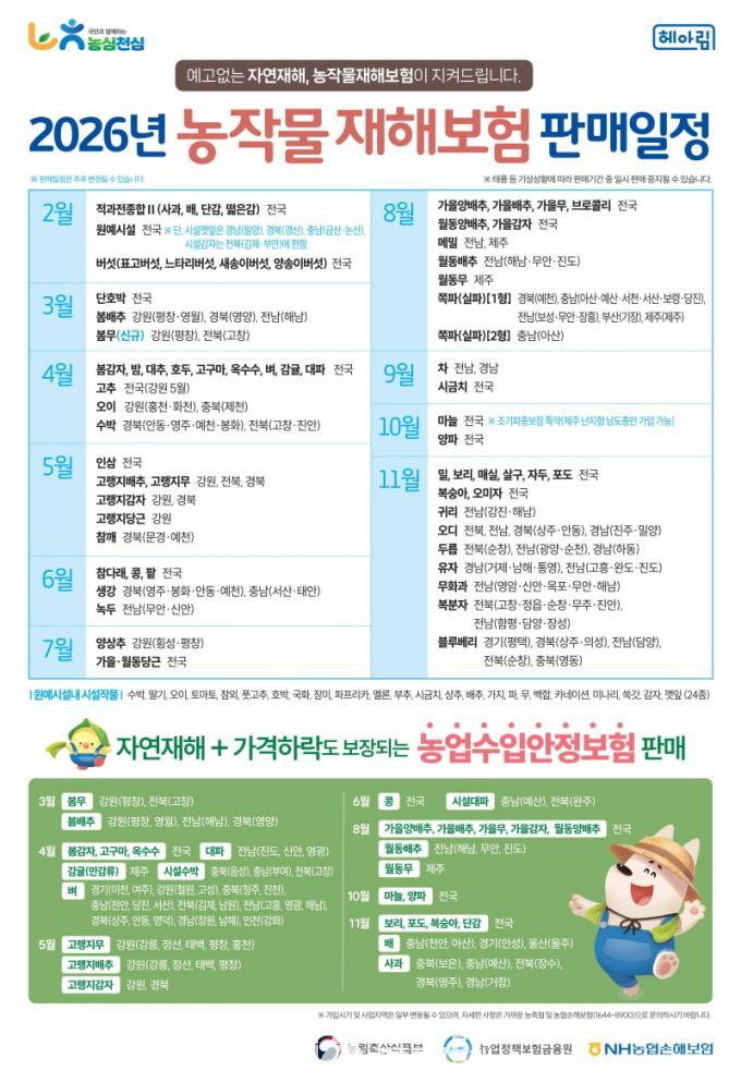 ³óÀÛ¹°ÀçÇØº¸ÇèÀº ÅÂdz¡¤¿ì¹Ú µî ÀÚ¿¬ÀçÇØ¿¡ µû¸¥ ³óÀÛ¹° ÇÇÇØ¸¦ º¸ÀåÇÏ´Â Á¦µµ´Ù. °¡ÀÔ ´ë»óÀº ³ó¾÷°æ¿µÃ¼¿¡ µî·ÏµÈ ³ó¾÷Àΰú ³ó¾÷¹ýÀÎÀÌ¸ç º, ¹èÃß µî ÃÑ 78°³ ǰ¸ñ¿¡ °¡ÀÔÇÒ ¼ö ÀÖ´Ù.