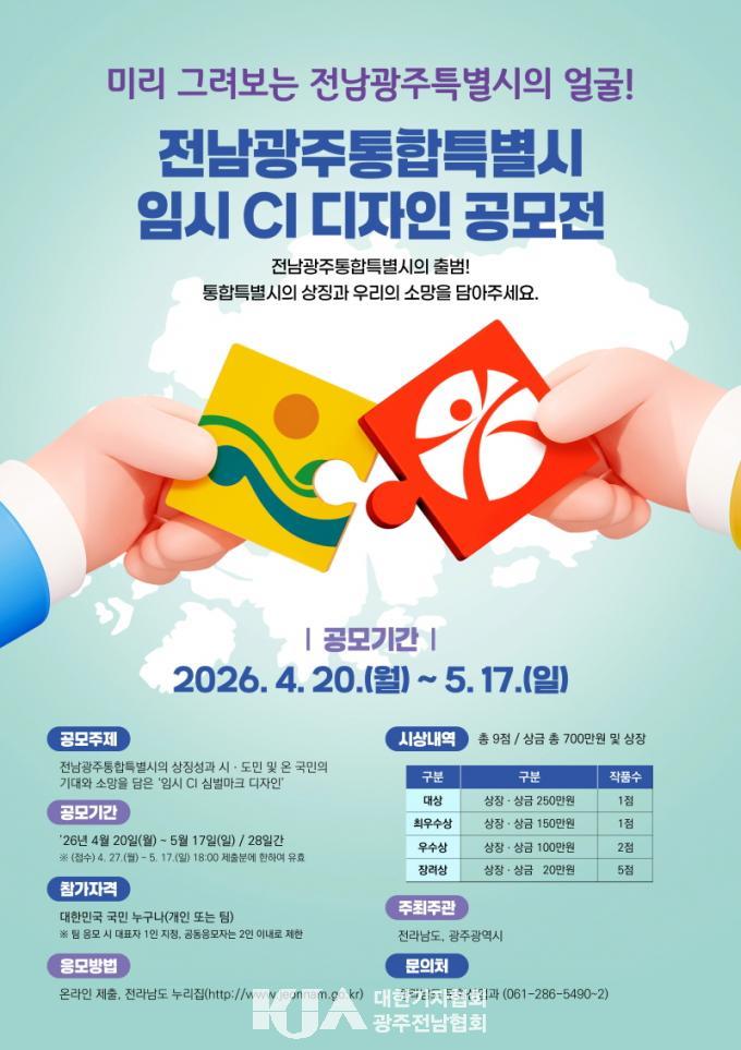 [´ëÇѱâÀÚÇùȸ ±¤ÁÖÀü³²Çùȸ] Àü¶ó³²µµ¿Í ±¤ÁÖ±¤¿ª½Ã´Â ÅëÇÕÆ¯º°½ÃÀÇ »ó¡¼ºÀ» ³ªÅ¸³»´Â Àü³²±¤ÁÖÅëÇÕÆ¯º°½Ã Àӽà CI µðÀÚÀÎÀ» 5¿ù 17ÀϱîÁö 28Àϰ£ Àü±¹¹ÎÀ» ´ë»óÀ¸·Î °ø¸ðÇÑ´Ù°í ¹àÇû´Ù.