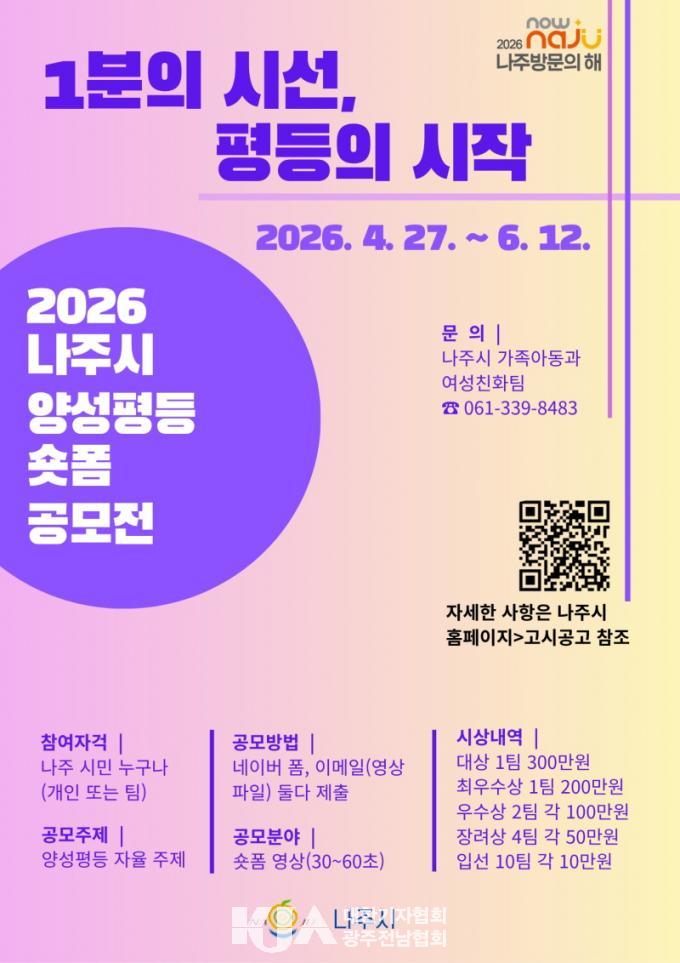 ³ªÁֽô ¡®2026³â ³ªÁֽà ¾ç¼ºÆòµî ¼ôÆû ¿µ»ó °ø¸ðÀü¡¯À» ÃßÁøÇÑ´Ù°í 28ÀÏ ¹àÇû´Ù. À̹ø °ø¸ðÀüÀº ¡®1ºÐÀÇ ½Ã¼±, ÆòµîÀÇ ½ÃÀÛ¡¯À» ÁÖÁ¦·Î ÀÏ»ó»ýȰ ¼Ó ¾ç¼ºÆòµîÀ» ¼ÒÀç·Î ÇÑ Ã¢ÀÇÀûÀÎ ¿µ»ó ÄÜÅÙÃ÷¸¦ ¹ß±¼Çϱâ À§ÇØ ¸¶·ÃµÆ´Ù.