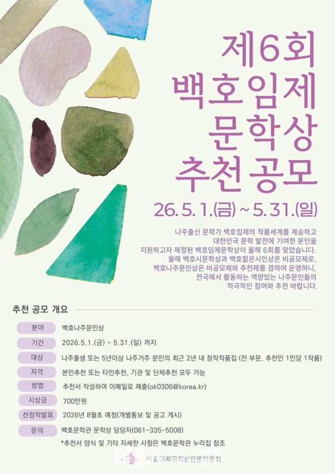 | ³ªÁÖ½Ã, Á¦6ȸ ¹éÈ£ÀÓÁ¦¹®ÇÐ»ó ³ªÁÖ¹®Àλó Ãßõ Á¢¼ö ½ÃÀÛ 5¿ù ÇÑ ´Þ°£ Á¢¼ö¡¦ÃÖ±Ù 2³â ³» âÀÛÁý ´ë»ó, ½Ã»ó±Ý 700¸¸ ¿ø |
